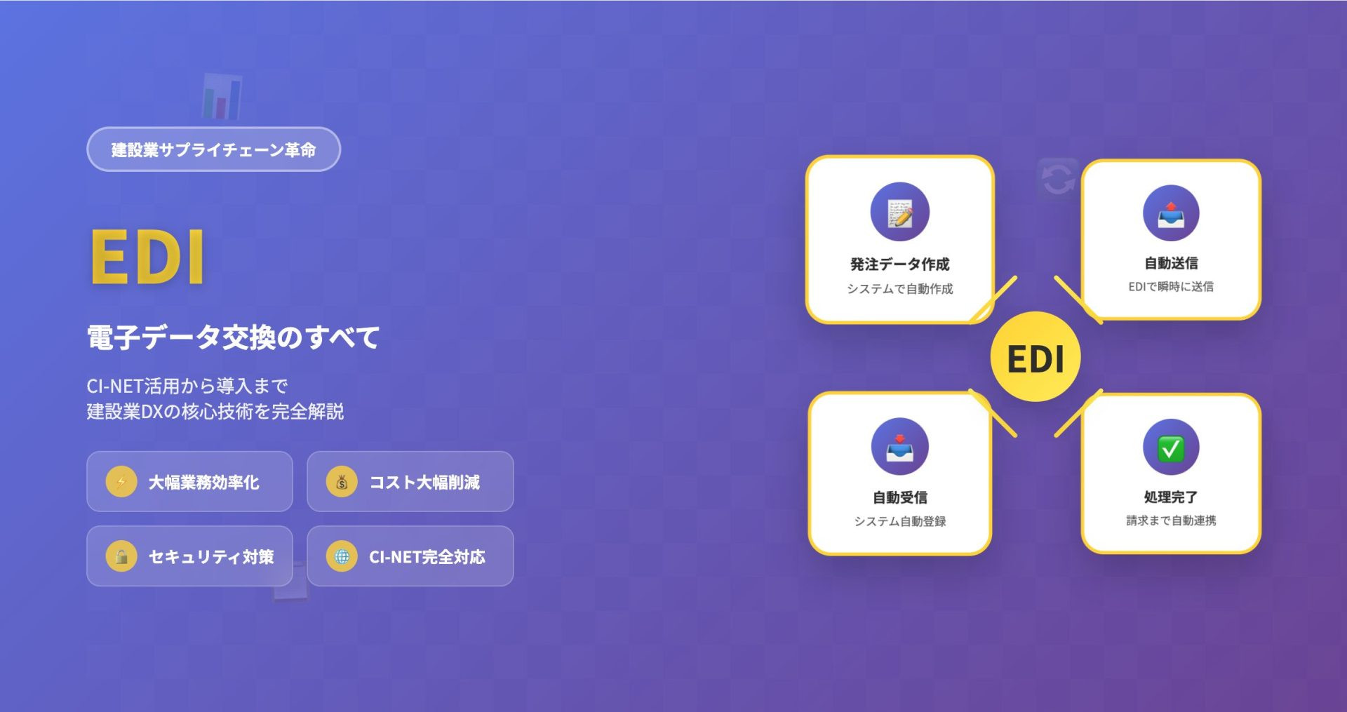 はじめに 建設業界では、元請企業と専門工事業者、資材メーカー、協力会社など、多数の企業が複雑なサプライチェーンを形成しています。見積依頼、発注、請求、検収といった商取引において、従来は紙の書類や電話、FAXでのやり取りが主流でしたが、これらの方法は時間がかかり、入力ミスや書類紛失などのリスクも伴います。 こうした課題を解決する手段として注目されているのが「EDI(Electronic Data Interchange:電子データ交換)」です。EDIは、企業間の商取引情報を電子データで自動的に交換する仕組みで、業務効率化、コスト削減、取引の透明性向上など、多くのメリットをもたらします。 特に建設業界では、国土交通省が「CI-NET(Construction…