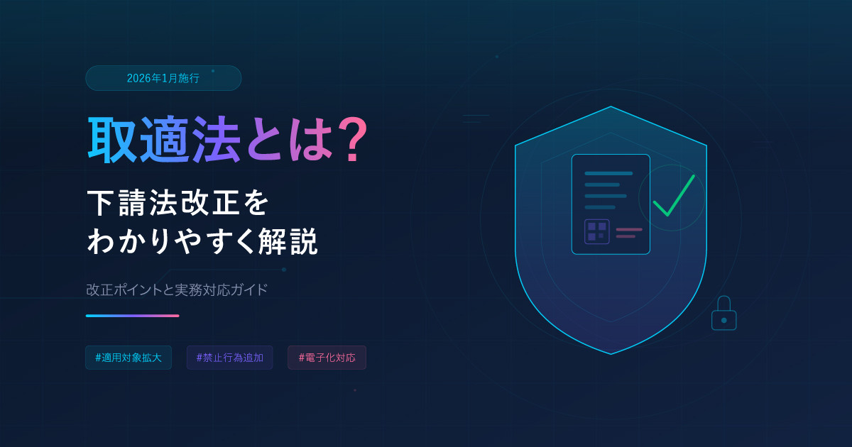 2026年1月1日、従来の下請法が大きく改正され「中小受託取引適正化法(略称:取適法)」として施行されました。法律の名称変更にとどまらず、適用対象の拡大や新たな禁止行為の追加など、委託事業者・中小受託事業者の双方に影響する改正が数多く盛り込まれています。製造業や運送業をはじめ、幅広い業種の発注者・受託者が対応を求められる法改正です。 本記事では、取適法の基本的な定義から主要な改正点、委託事業者に課される義務や禁止行為、違反した場合のペナルティ、そして施行後に事業者が取り組むべき実務対応まで、わかりやすく網羅的に解説します。取引の適正化に向けた準備にぜひお役立てください。 取適法の基本概念と目的 取適法とは何か? 適法とは「中小受託取引適正化法」の略称で、「とりてきほう(トリテキほう)」と読みます。従来の「下請代金支払遅延等防止法(下請法)」が2026年1月に改正・施行されたもので、中小受託事業者と委託事業者との間の取引を適正化するための法律です。 下請法では「親事業者」と「下請事業者」という用語が使用されていましたが、取適法では「委託事業者」と「中小受託事業者」に名称が変更されました。これは、従来の上下関係を連想させる表現を改め、対等な受発注関係の実現を目指す姿勢を反映しています。法律名そのものに「適正化」が含まれていることからも、単なる支払遅延の防止にとどまらず、取引全体の公正さを確保しようとする法改正の意図が読み取れます。 取適法の適用範囲は、製造委託、修理委託、情報成果物作成委託、役務提供委託の4つの委託取引です。資本金や従業員数の基準に基づき、委託事業者と中小受託事業者の該当要件が定められています。従来の資本金基準に加え、従業員300人以下の企業も新たに適用対象となるなど、規制対象が拡大されたことが大きな特徴です。 取適法の目的と意義 取適法の最大の目的は、中小受託事業者の利益を保護し、委託取引の適正化を図ることです。近年、原材料費やエネルギーコスト、人件費(労務費)の上昇にもかかわらず、価格転嫁が十分に進まない実態が問題視されてきました。取適法の施行により、委託事業者には適正な価格協議に応じる義務が課され、一方的な代金決定が明確に禁止されています。 また、独占禁止法の補完法としての役割も重要です。公正取引委員会と中小企業庁が所管し、取引の公正さを確保するための実効性ある制度運用を目指しています。法改正の背景には、中小企業が安心して事業を営める環境の実現という方針があり、日本経済全体の活性化に資することが期待されています。 取適法の主要な改正点 法律名・用語の変更 今回の改正で最も目立つ変更は、法律の名称が「下請代金支払遅延等防止法」から「中小受託取引適正化法」に改められた点です。従来の「親事業者」は「委託事業者」に、「下請事業者」は「中小受託事業者」に変更されました。 この名称変更は単なる呼び替えではありません。従来の下請法が「支払遅延の防止」を主眼としていたのに対し、取適法は取引全体の適正化を目的としており、法律の射程が大きく広がったことを意味しています。フリーランスを含む個人事業主への適用範囲も明確化され、より幅広い取引関係をカバーする法律へと進化しました。 適用対象の拡大 取適法では適用対象が従来から大幅に拡大されています。具体的には、資本金基準に加えて従業員数基準が導入され、資本金の額にかかわらず従業員300人超の企業が委託事業者に該当する可能性があります。また、運送委託も新たに適用対象として追加されました。 これにより、従来は下請法の規制対象外であった企業も取適法の適用を受けることになります。自社が委託事業者に該当するかどうか、取引先が中小受託事業者に該当するかどうか、改めて確認しておくことが重要です。 新たな禁止行為の追加 取適法では、従来の11の禁止行為に加えて新たな規制が強化されました。特に注目すべきは「協議に応じない一方的な代金決定の禁止」です。委託事業者が中小受託事業者からの価格協議の求めに応じず、一方的に代金を決めることが明確に禁止行為として定められました。 また、買いたたきの判断基準もより具体化され、原材料費や労務費、エネルギーコストの上昇を著しく反映しない価格設定は禁止行為に該当する可能性があります。報復措置の禁止も強化されており、中小受託事業者が公正取引委員会に申告したことを理由に不利益な取扱いを行うことは厳しく禁じられています。 委託事業者に課される義務 発注内容の明示義務 取適法では、委託事業者は発注時に取引の内容、代金の額、支払期日、納期などの事項を書面または電磁的方法で中小受託事業者に明示しなければなりません。発注内容に変更が生じた場合も、速やかにその旨を通知する義務があります。この明示義務は、口頭での発注が曖昧なトラブルを招いてきた実態を踏まえた