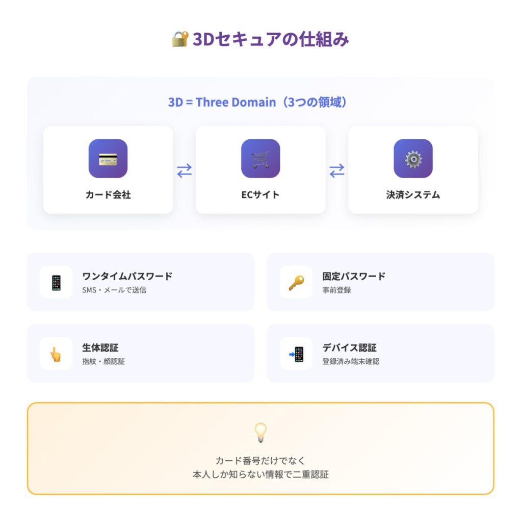 第三者が勝手に使うことの防止: カード番号や有効期限などの基本情報が漏洩した場合でも、3Dセキュアではカード所有者本人しか知り得ない追加情報(パスワードやワンタイムパスワード)による認証が必要です。そのため、第三者が勝手に使用することは極めて困難になります。