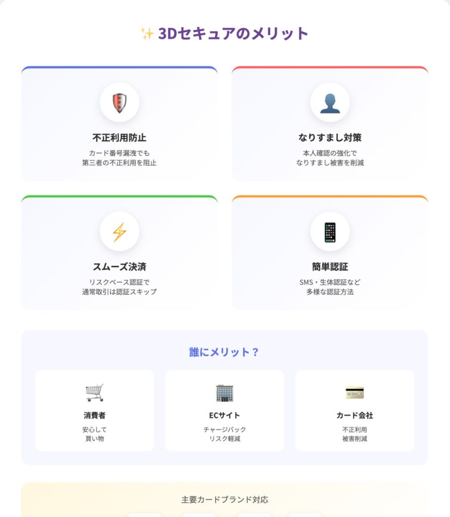 - メリット:不正利用の防止、なりすまし被害の削減、フィッシング詐欺対策など、消費者と加盟店の双方に多くのメリットがあります。