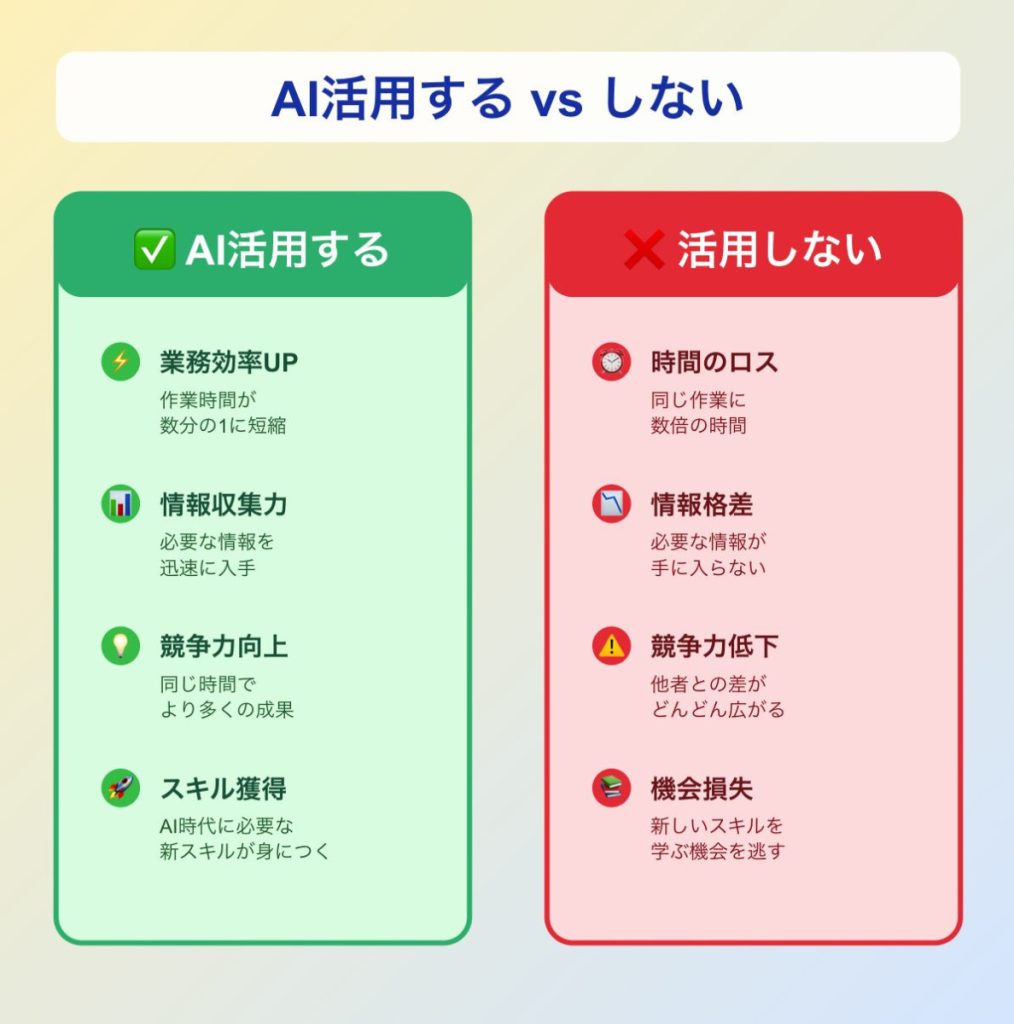 ビジネスの意思決定、学習効率、問題解決のスピードなど、あらゆる場面で情報収集力が問われます。AI活用によりこの能力を拡張できる環境で、それを活用しないのは機会損失とも言えるでしょう。