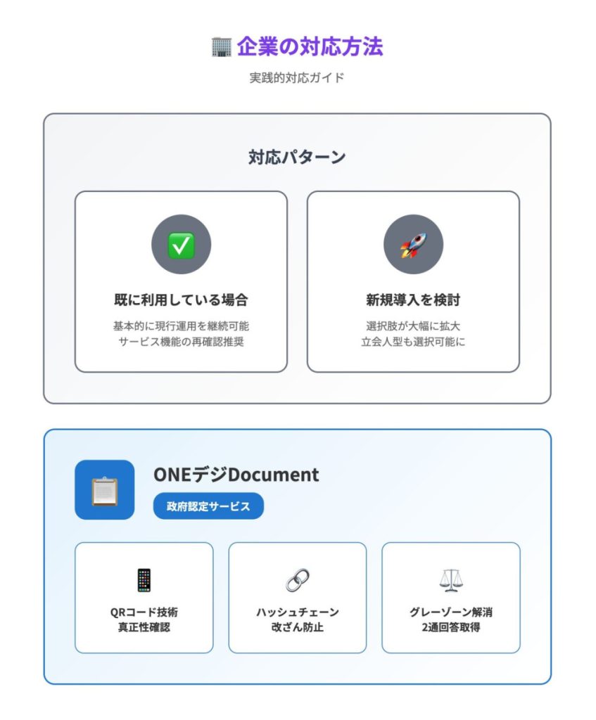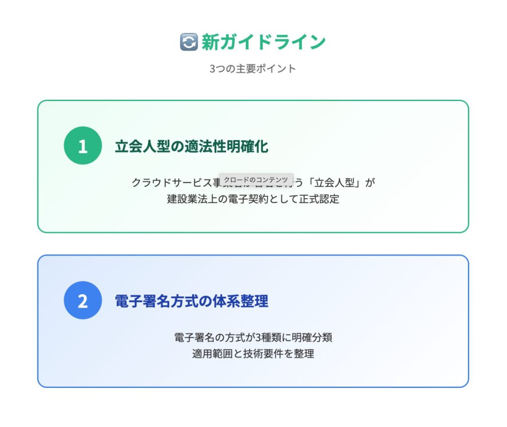 旧ガイドラインでは立会人型の適法性が明記されておらず、各社がグレーゾーン解消制度で個別対応していました。新ガイドラインでは、立会人型も建設業法上の電子契約として利用可能であることが初めて公式に明示されました。