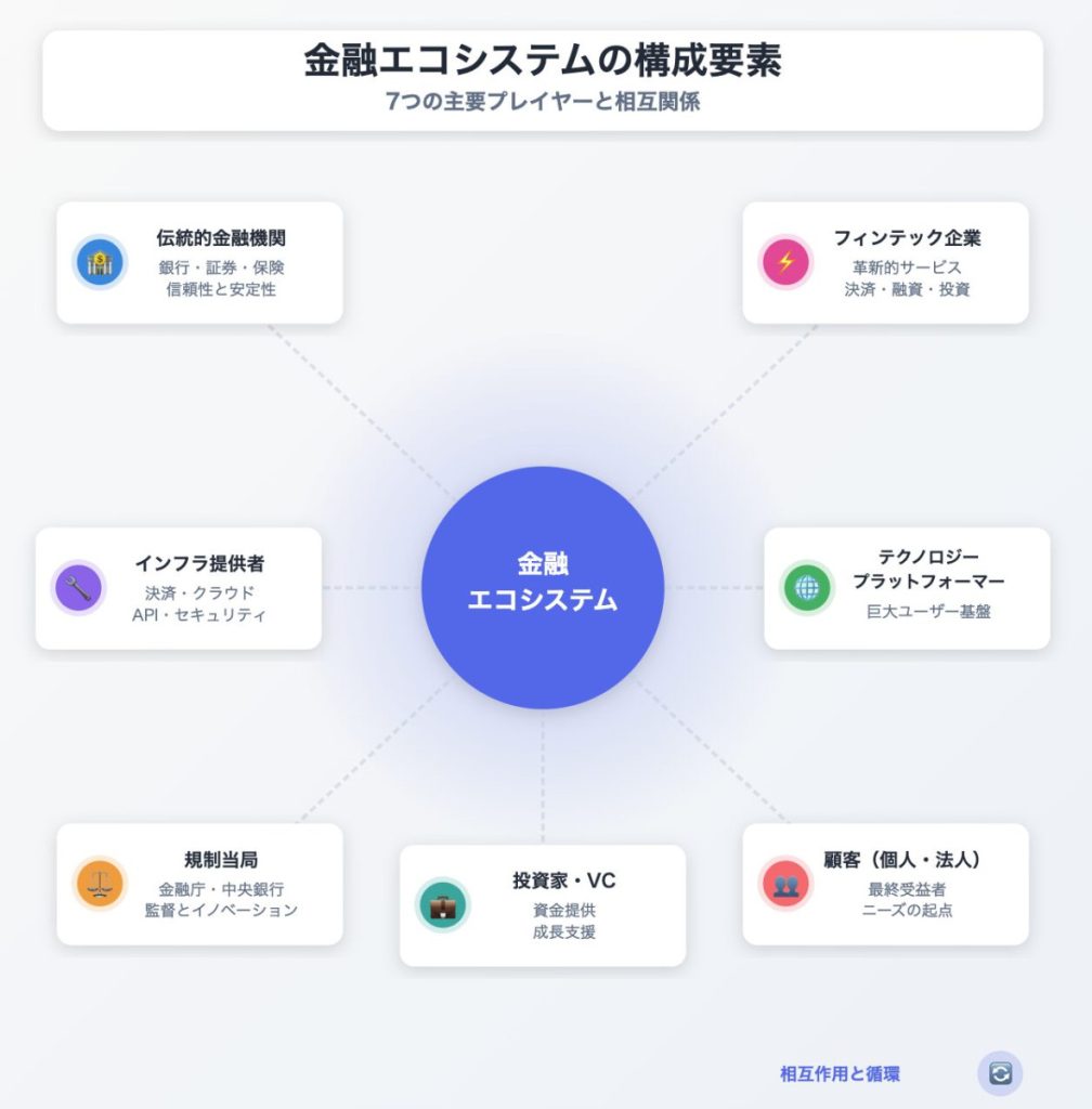 金融エコシステムを構成する主要な要素は以下の通りです。