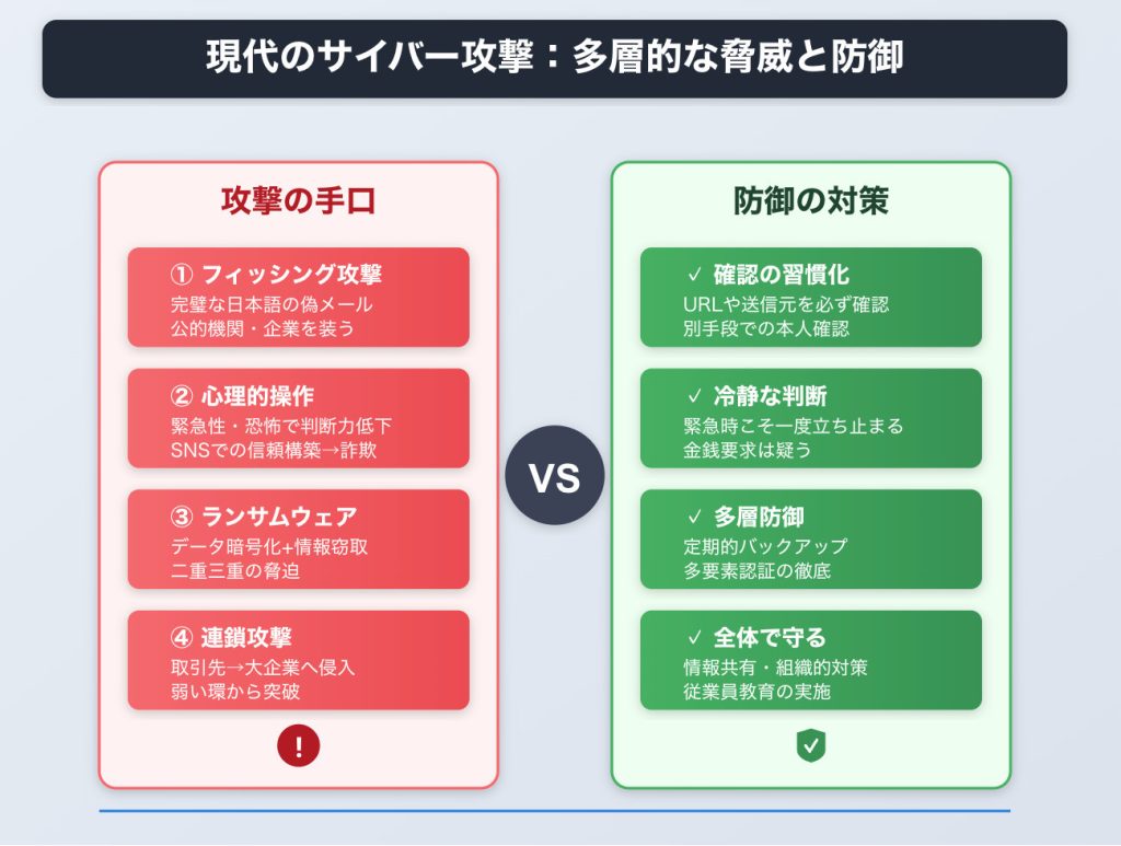- 組織への脅威: 大企業だけでなく、その取引先を入り口とする連鎖的な攻撃や、多重的な脅迫が一般化しています。
