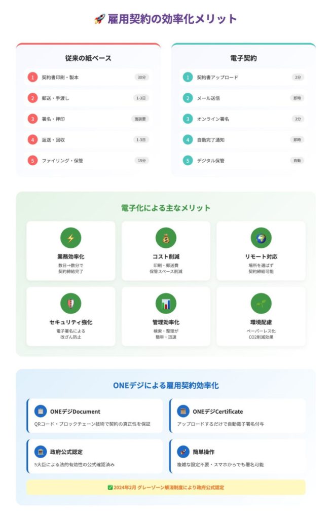 - 電子化のメリット:ONEデジDocumentのような政府認定を受けた電子契約サービスを活用することで、業務効率化、コスト削減、コンプライアンス強化が実現できます。