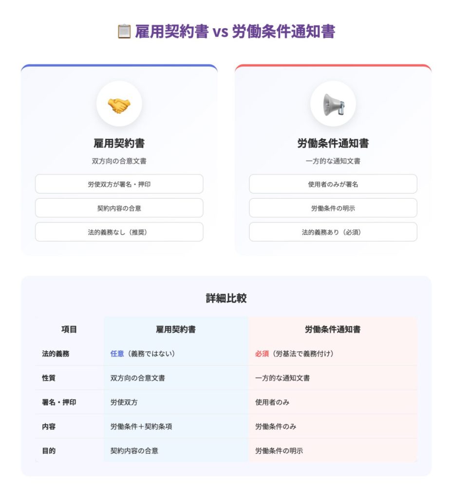 雇用契約書とよく混同されるのが「労働条件通知書」です。両者の違いを正しく理解することが重要です。