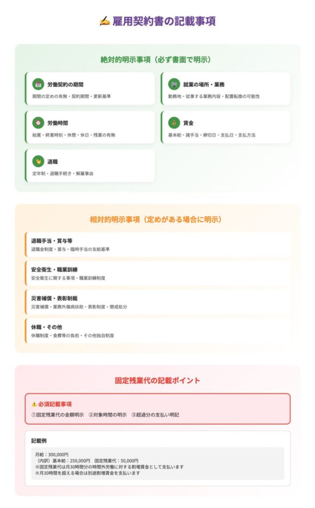 - 記載すべき事項:労働基準法で定められた絶対的明示事項は必ず記載し、固定残業代などの特殊な制度は、法的要件を満たす記載が必要です。
