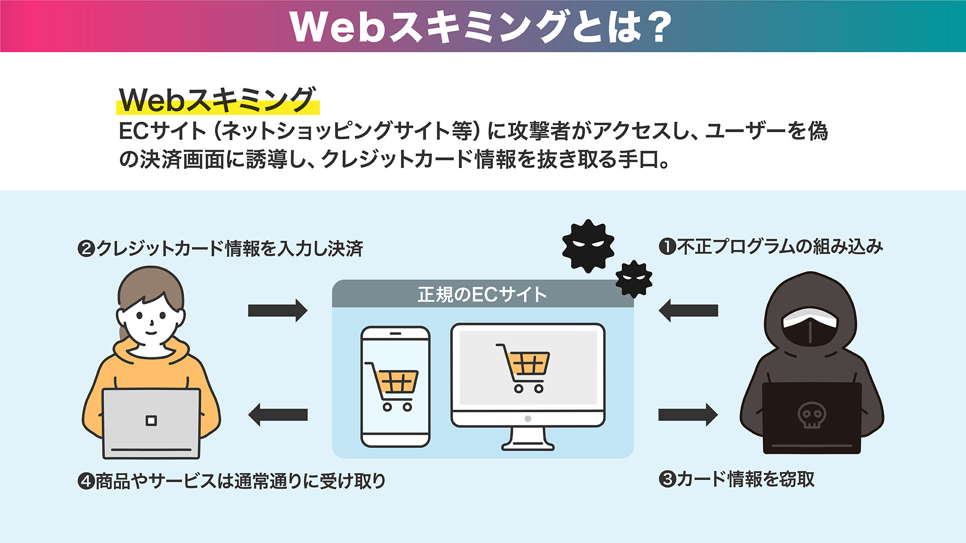 また、WEBスキミングという手口は先ほど申し上げたとおり、正規サイトに似せた偽サイトを立ち上げるものです。これに攻撃者が不正侵入し、決済画面を改ざんすることで、決済に関する情報が読み込まれるというもの。このような手口で情報を盗むのです。