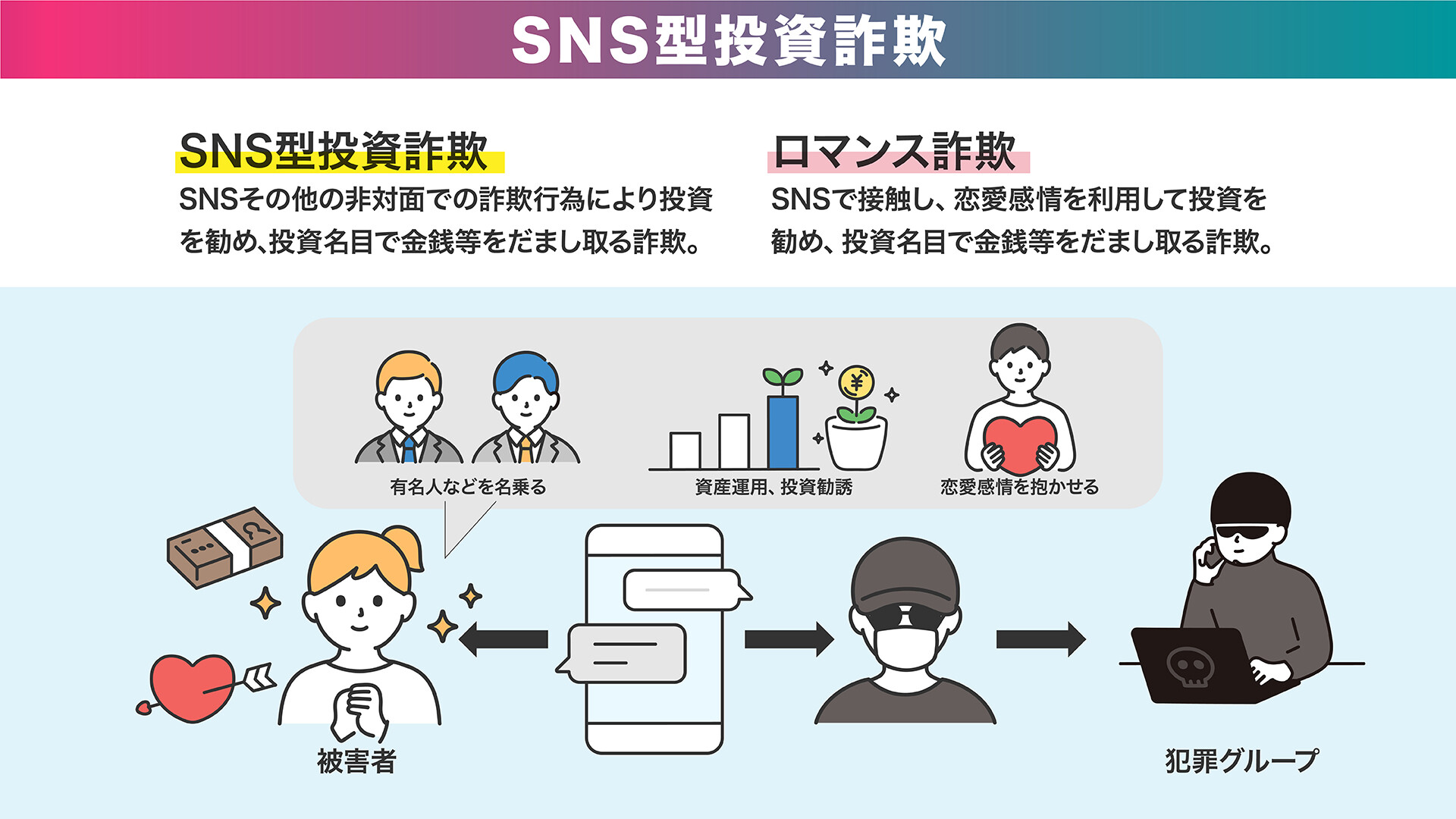 橘:どのような対策が取られていますか? 河原:キャッシュレス社会の中で、安心安全にサービスを利用するためには、警察による捜査など取り締まりも非常に重要ですが、被害を未然に防止して仮に被害にあっても拡大を防止していく、このようなアプローチが非常に重要になると思います。また、SNS型投資詐欺やSNS型のロマンス詐欺については、海外の犯罪グループの関与がうかがわれ、匿名流動型犯罪グループという犯罪集団が関与している可能性もあります。