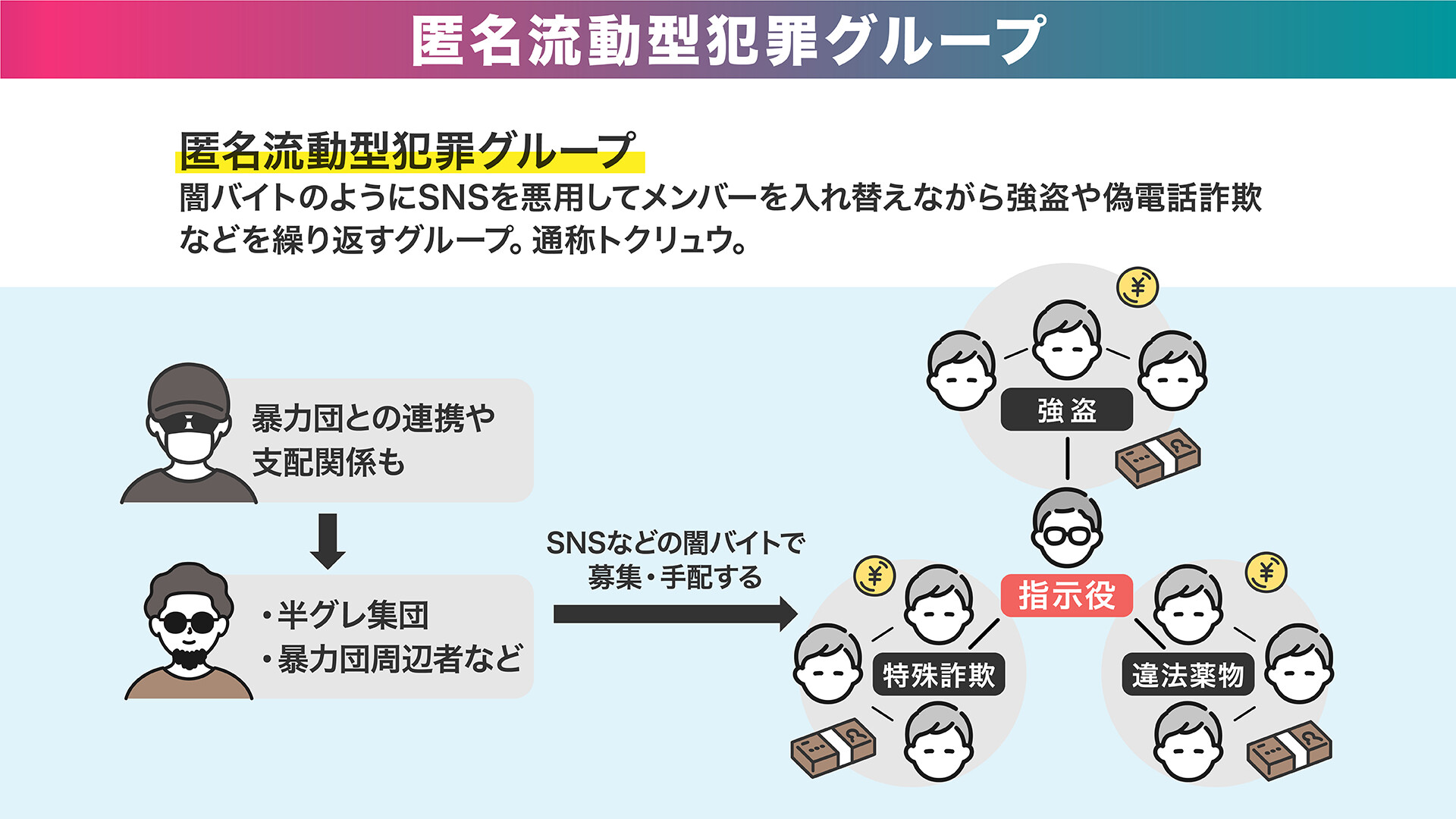 橘:匿名流動型犯罪グループとは? 河原:匿名流動型犯罪グループとは、互いの素性を知らずにSNSで連絡を取り合うなど、非常に匿名性が高く、結びつきも緩やかで、離合集散を繰り返していく。従来の犯罪組織とは大きく異なる特徴を持つ犯罪集団を総称したものです。 警察は組織犯罪対策部門が中心となり、このような犯罪グループの関与も常に視野に入れ、実態解明に向けて努力しています。特殊詐欺連合捜査班特別の捜査組織というのもあり、捜査と抑止の両面から策を推進しているところです。 橘:警察捜査とテクノロジーは、切っても切り離せないものですね。 河原:サイバー犯罪はもちろん、それ以外の様々な犯罪の捜査において、デジタルやITの素養が求められる時代になったと感じます。