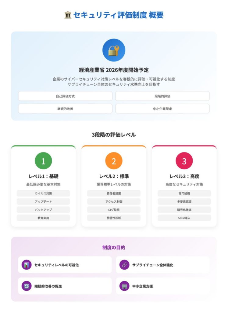 この新制度は、企業のセキュリティ対策レベルを客観的に評価し、可視化することで、サプライチェーン全体のセキュリティ水準の底上げを目指すものです。特に、大企業と取引を行う中小企業にとっては、今後の取引継続に影響を与える可能性のある重要な制度となります。