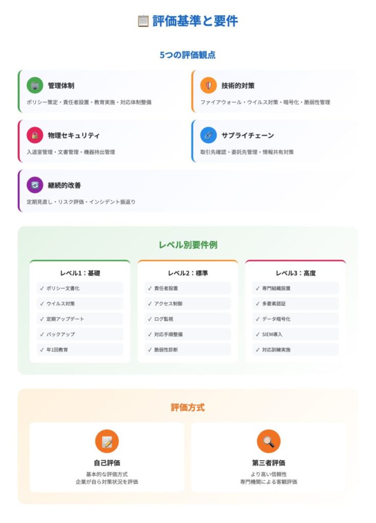 - 評価の仕組み:企業のセキュリティ対策を複数の観点から評価し、段階的にレベル分けします。基本的には自己評価方式です。