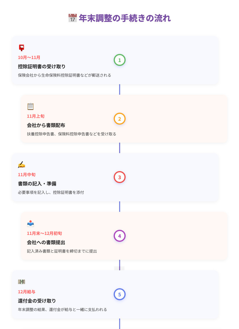 年末調整の手続きは、通常10月頃から始まります。会社から配布される書類と、自宅に届く各種の控除証明書を準備する必要があるため、早めに準備を始めることが大切です。