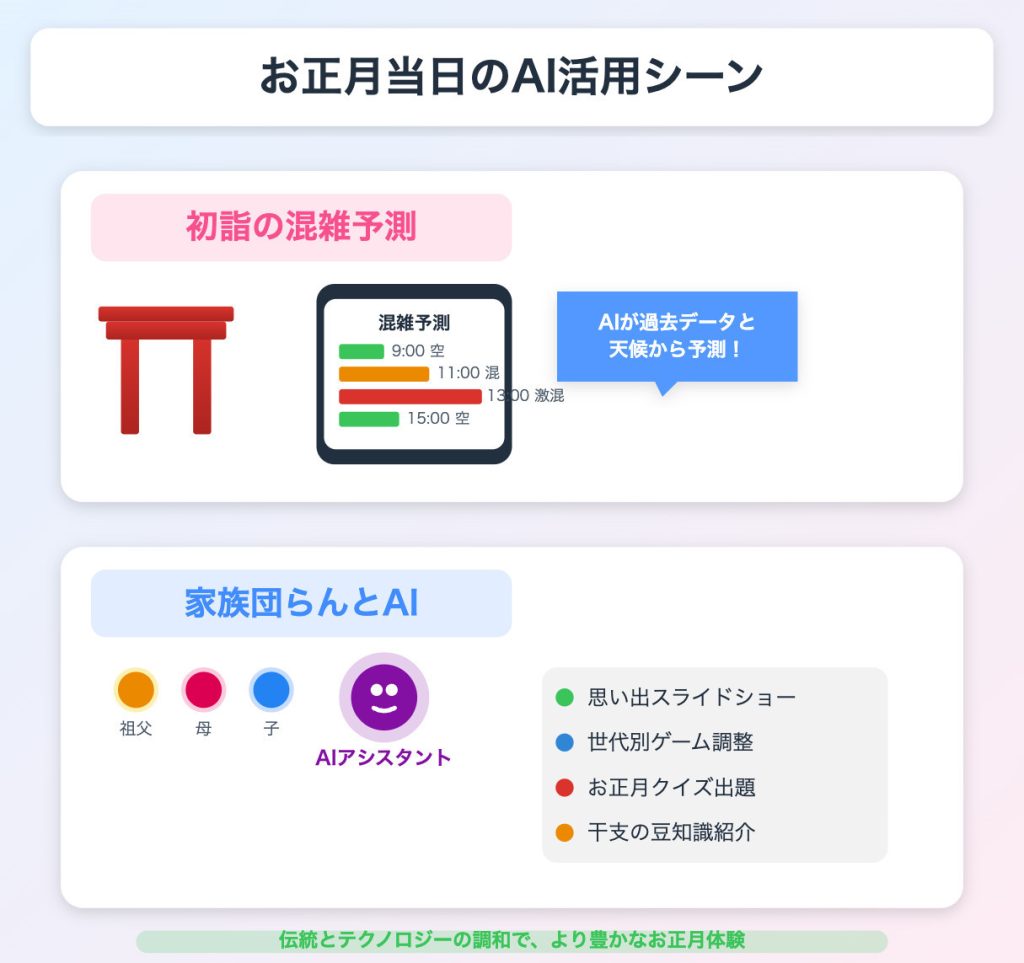おせち料理の準備から年賀状作成、大掃除、初詣の混雑回避、家族団らんのエンターテインメント、地域文化の継承、ビジネスの効率化まで、AIはお正月のあらゆる場面で私たちをサポートしています。そして今後、パーソナライズされた体験や仮想現実技術により、お正月の楽しみ方はさらに多様化していくでしょう。