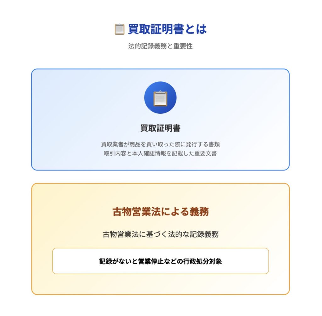 買取証明書とは、買取業者が商品を買い取った際に発行する書類で、取引日、買取対象品の詳細、取引金額、本人確認情報などを記載します。古物営業法に基づく法的な記録義務を満たすための重要文書です。