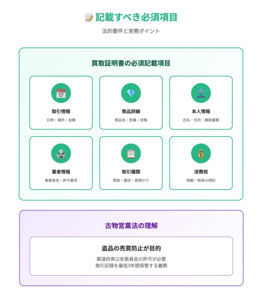 古物営業法に基づき、氏名、住所、連絡先、生年月日、本人確認書類の種類と番号を記載。買取業者の情報として、事業者名、古物商許可番号(必須)、所在地、担当者名も記載します。