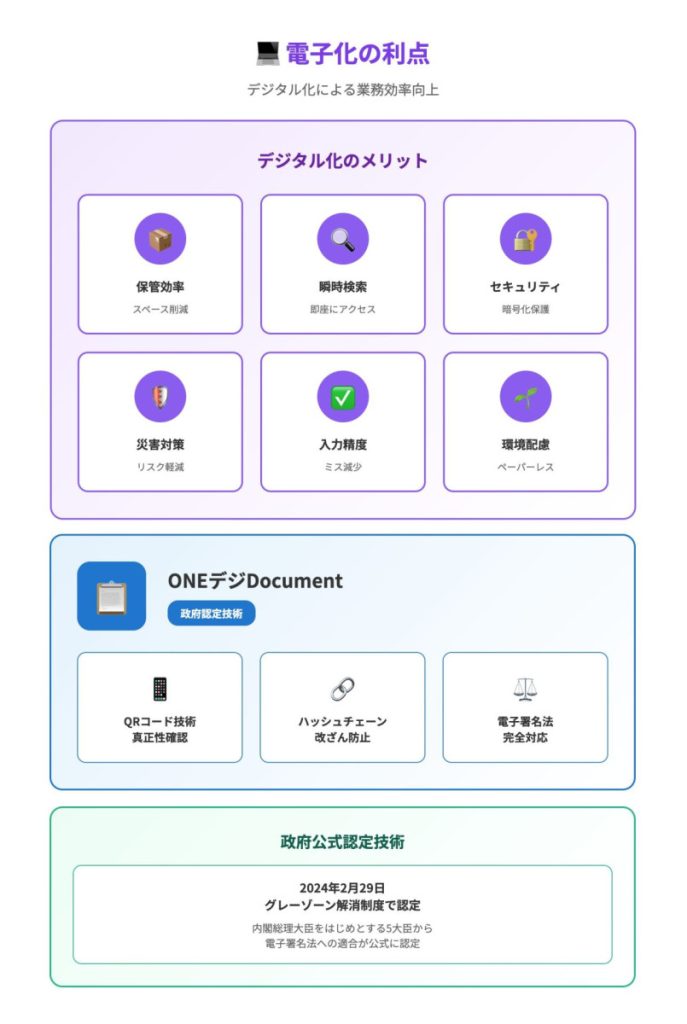 保管スペース削減、瞬時検索、パスワード保護・暗号化でセキュリティ強化、災害時リスク軽減、入力ミス減少、ペーパーレス化で環境配慮を実現できます。