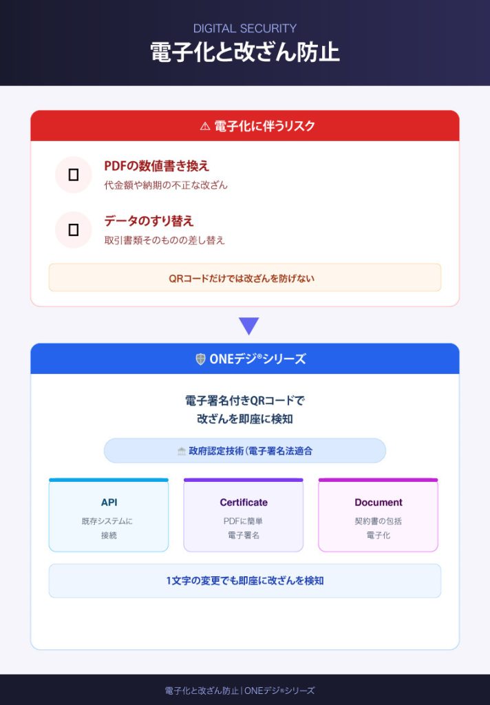 なお、取引書類の電子化を進めるにあたっては、書類の真正性をいかに担保するかが重要な課題です。PDFの数値書き換えやデータのすり替えといった改ざんリスクは、電子化が進むほど深刻になります。既存のQRコード付きサービスも登場していますが、単にQRコードが付いているだけでは改ざんを完全に防ぐことはできません。