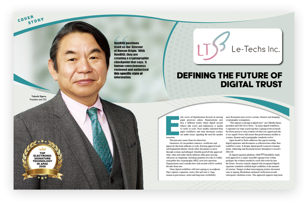 「多くのデジタルワークフローにおいて、 電子署名は『署名イベントが発生したこと』を証明するにとどまっています。 何が・なぜ署名されたかを保存し、 暗号規格が進化してもその証明の信頼性を維持できるものはさらに少ない」とリーテックスの代表取締役社長・小倉隆志氏は指摘します。 リーテックスは、電子署名と文書を単なるワークフローのイベントではなく「インフラ」として扱うことでこのギャップを埋めています。 同社の電子署名プラットフォーム「ONEデジ」は、各承認を追跡可能な署名イベントに結びつけ、 遠い将来まで検証できる証拠をパッケージ化します。